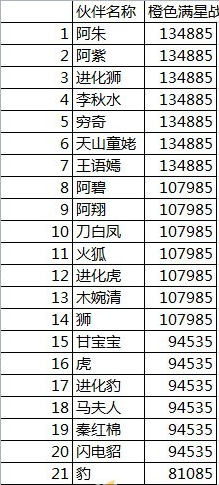 下面嘟嘟奉献上各个伙伴橙色满星战力表~小伙伴不要吓尿哦~
