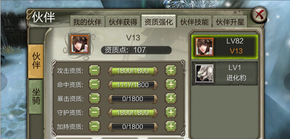 看到了没~当前版本不像上一个版本那样一点资质固定就是10战斗力,竟然不同属性高资质加的战斗力不一样,果断优先加满攻击,守护和命中。这里要配合上伙伴升星,升星能提高资质的上限,一次强化好像是提高300上限,比如小编的伙伴现在资质上限是1800,我进化到6星后,资质上限会变成2100,我就有更多的资质点分配到攻击力这块资质上。那我能提高的战斗力就更大