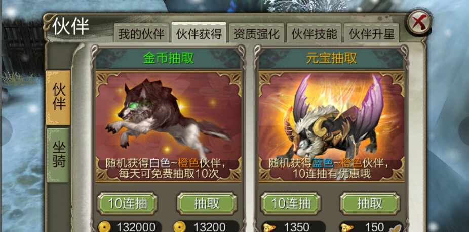 第二种就是金币抽取,每天凌晨12点过后就刷新,可以免费抽取10次,小编我自己除了免费金币抽取外,还额外用了金币的10连抽,才7万多金币,第二次10连抽要13万,小编就放弃了。金币抽取也是有几率获取橙色伙伴的,小编现在用的橙色钟灵就是金币抽到的。