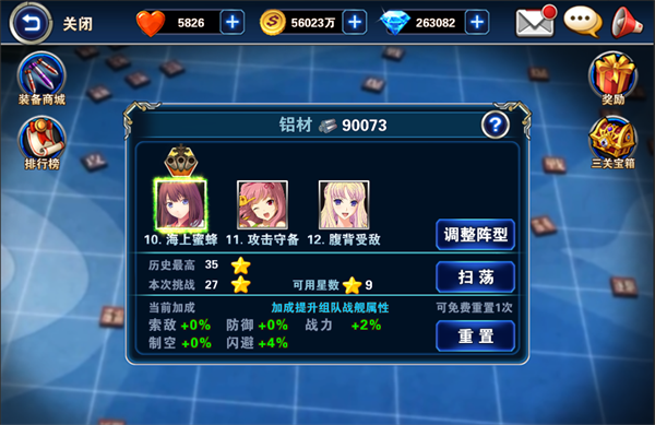 联合军演每关的通过条件都不一样, 所以要合理的利用属性加成才能过关,当玩家等级达到一定级别,并且3星通过的关卡,可以使用扫荡,节省大量时间。