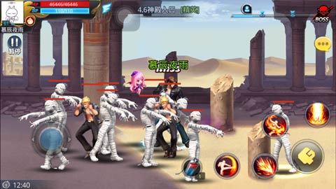 当玩家进入第一关卡的时候会有乌鸦飞出来的,再往地图的右边走的时候只会出现两个手拿匕首的敌人,跑过去之后才会从沙子里面出来很多木乃伊。由于怪物基本都是在同一直线上面的,所以推荐玩家使用群伤的技能,这样可以一次性全部秒杀掉,省去玩家很多的时间了。