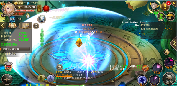 副本中每参与击杀一只小怪能够积累一点能量值,取得小怪最后一击能够额外获得一点能量值,自己的能量值会积累到界面聊天窗口上方的能量球中,点击能量球可以将自己的能量注入左侧统计界面中的队伍能量条中。