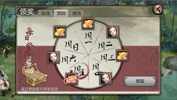 每天登陆游戏都有奖励领取,其中周一周三周五周日分别可以领取10,20,20,,20的元宝。