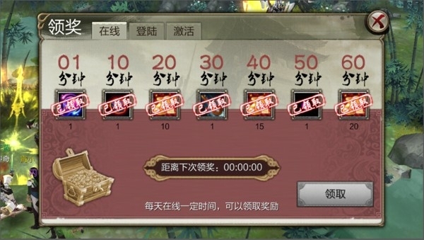 每天在线游戏超过1小时都能领取在线奖励,其中20,40,60分钟分别可以获得10,15,20元宝的奖励,加起来就有45元宝了。