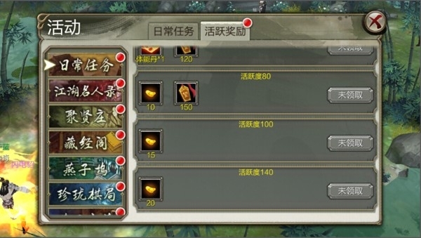 每日的日常任务完成活跃度越80,100,140都能获取10,15,20的元宝奖励,所以把每天活跃度都完成到140。就能获得45的元宝。日常任务要做8活跃度的副本任务+25次4活跃度的门派任务,这样刚好140活跃度。