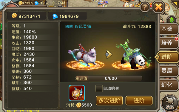 酷炫的坐骑形象快到碗里来!坐骑的进阶是一个积累幸运值的过程,每一次使用一定数量的进阶石,有几率让自己的坐骑进阶到下一阶段。进阶失败则会累加幸运值,幸运值越高,进阶成功的几率越大。坐骑进阶以后不但可以大幅提升属性,还能够激活新的坐骑形象,提高坐骑的移动速度,还在等什么!