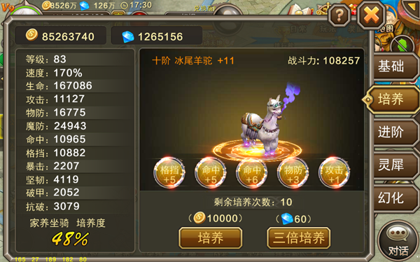 玩家每天有1次免费培养,和10次使用金币或是钻石对坐骑进行培养的机会,培养坐骑可以直接提升坐骑的属性。当然,使用钻石培养的属性提升是金币的三倍!