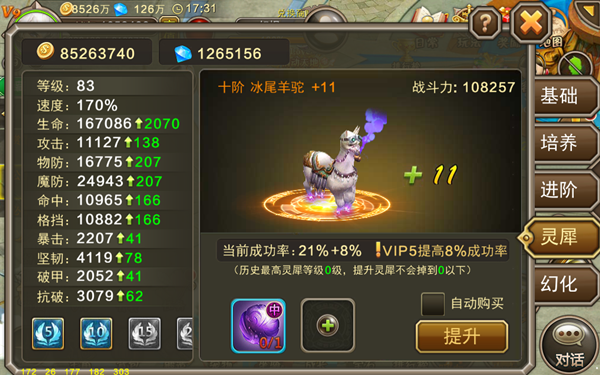 与提升的风险相对的是坐骑灵犀等级提升之后大幅度的战力提升,而且到达一定的等级之后还有额外的属性加成哦。