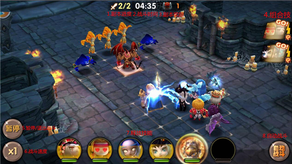 8.自动战斗:开启自动战斗后,当英雄的怒气积攒满时,将会自动释放技能。如果有两个英雄的怒气同时积攒满时,会默认从左到右依次释放。