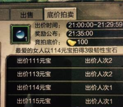 1.首先大家要完全理解活动介绍中“最低且唯一” 不是你的价钱最低就能拍到.例如图1是一个坚韧宝石的竞拍!起拍100元宝.那么大家都知道最低肯定就是101元宝.所以重点在其实在“且唯一” 上.图2是这颗宝石的中拍价.114元宝.出价人次1.这样有图看就比较好理解了.从101元宝到113元宝都有人拍.多且而重复了.但是 114元宝只有一个人出价.所以114元宝是离100元宝起拍价最近且唯一只有一个人出价的价格.所以竞拍成功.这样大家应该就能完全明白了吧!