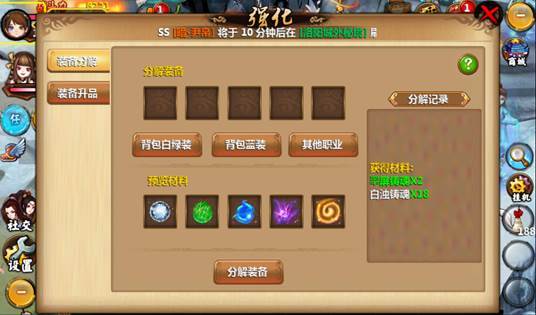 在达到11级的时候会开启装备分解功能,装备分解可以将你不使用的装备分解成装备材料。材料的用途可以用来升品装备哦。
