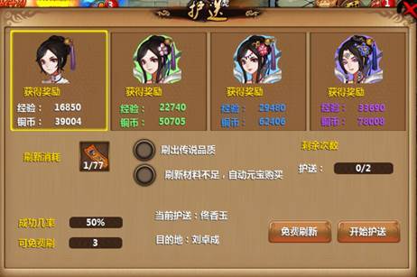 护送为每日全天可进行任务之一,可在洛阳城<护送使者>王虎处参与,并且在11:00—13:00及17:00—19:00会获得1.5倍奖励,刷新的品质越高获得的奖励越高,在这里当然选择1.5倍奖励时进行护送最为划算,而且每日都可以进行参与。