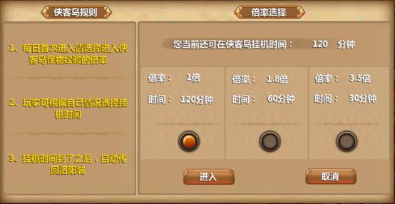 侠客岛可在日常中进行打开,每日全天可以进行参与,并且玩家可以选择进入的倍率,同时可以使用多倍经验丹,侠客岛内的经验收益可和经验丹重叠,这样会大大的提升等级。