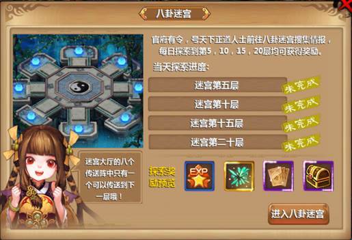 友情提示:在八卦迷宫中第3层,7层,11层,15层,20层存在侧门,可直接传送至9层,13层,17层,19层,和3层哦!