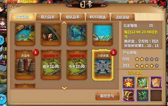 八卦迷宫可在日常中选定日常活动中打开,每日12:00—23:59分可以进行参加,也可以在洛阳城中NPC【名捕】冷血进入副本。