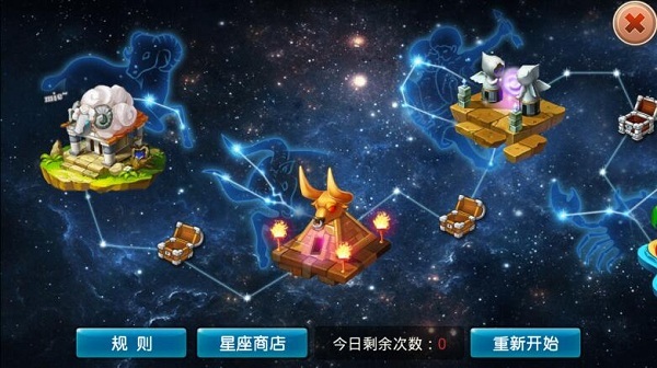 2.星座塔一共12关,每过一关便可开启相应关卡宝箱,12关全过可开启通关宝箱(内含大量金币,还有几率获得道具及 英雄碎片;一般每开三个宝箱后第四个箱子中出好东西的概率更大)