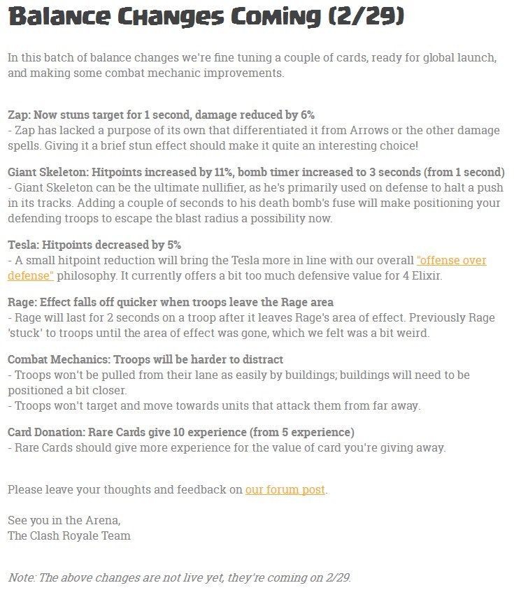 著名游戏厂商Supercell昨天在官网发布了《部落冲突:皇室战争》将在2月29日进行游戏更新,此次更新将着重调正游戏内的平衡性,在短短的10天内又进行一次数据调整想必开发商是为了3月的全球上架做准备,那么游戏中都会更新哪些内容,还请小伙伴们继续往下看。