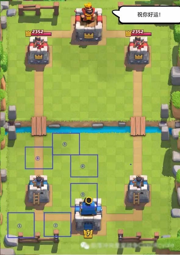 适合建筑:圣水采集器、召唤类小屋、以及特殊情况下的防御建筑优点:1、较安全,不刻意勾引基本不会被打。2、不会被火箭连带打到护卫塔。3、可以祈祷下对方手抖打醒了国王塔。缺点:1、配合4号位(黄金防守位)使用,会导致该区域较为拥挤,容易被法术一起送回去。2、很多人会习惯性在国王塔附近下法师,然后对方下雷电法术,很容易亏。