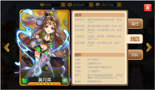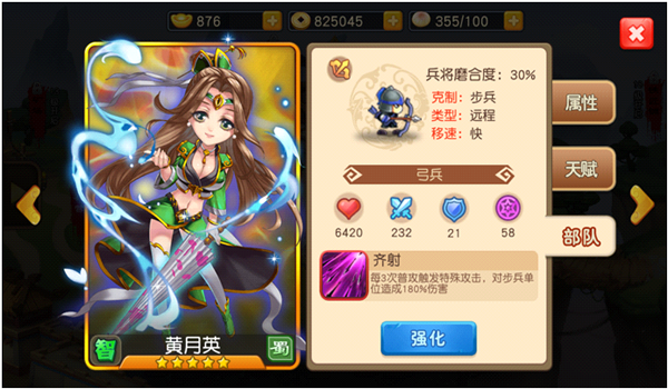 黄月英带领的是克制步兵的弓兵,作为一个辅助型英雄,其自身的武将技能和进阶技都完美的为勇猛武将提供强力辅助。