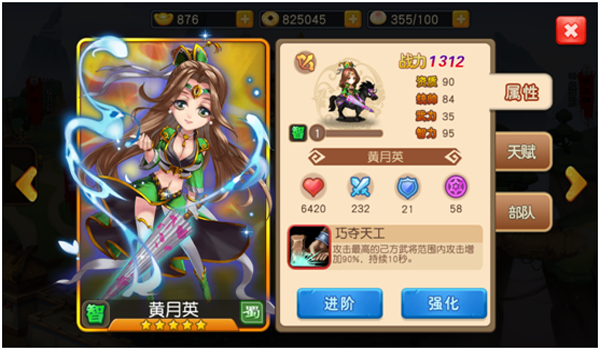 黄月英,诸葛亮的妻子,知识广博。 本作中,黄月英的初始战力为1312点,资质90点,统帅84点,智力达到了95点。 技能“巧夺天工”作用是为攻击最高的己方武将提高范围内90%攻击。 黄月英自身进阶..