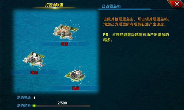 只搞定属于自己的资源,那怎么够大爷们肆无忌惮呢?去别的岛转转,打败他然后掠夺他!如果你足够强大,更可以抢占岛屿,让石油都到自己口袋里来,整个联盟的兄弟都可以一起吃香喝辣。老大!我们做永远的兄弟吧~