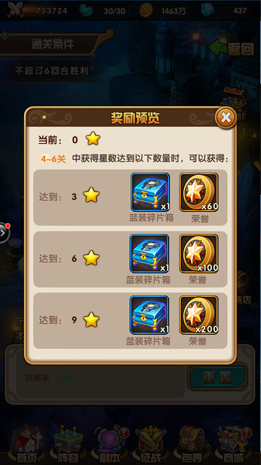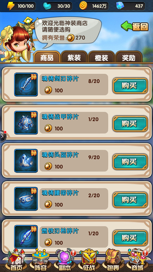 神装商店,各种等级装备碎片聚集地,蓝装、紫装、橙装各部位碎片一应俱全。通关英雄塔达到一定星数后可解锁对应奖励,含成品装备、装备精炼石、钻石、金币等多种奖励。