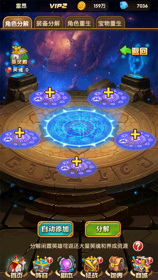 英灵殿,可以理解为抽奖池。这里有大量英雄碎片、经验宝宝、培养剂、突破石等材料,还有一定几率刷出完整英雄(PS,本座就是在这里凑齐了众多喜爱的橙色英雄)。每日刷新上限20次,使用刷新令可以免费刷新,无刷新令时可用元宝刷新。