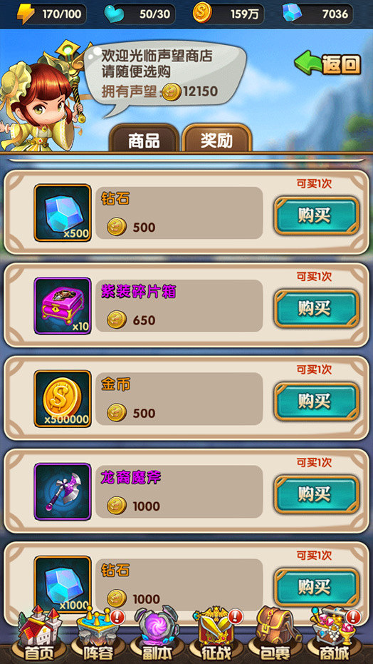 声望商店,竞技场专属商店。日常出售的商品有固定橙色英雄碎片、培养剂和突破石,竞技场排名达到一定要求可购买奖励道具,奖励道具有成品紫色装备、钻石、金币、经验宝物、经验宝宝等丰富内容。