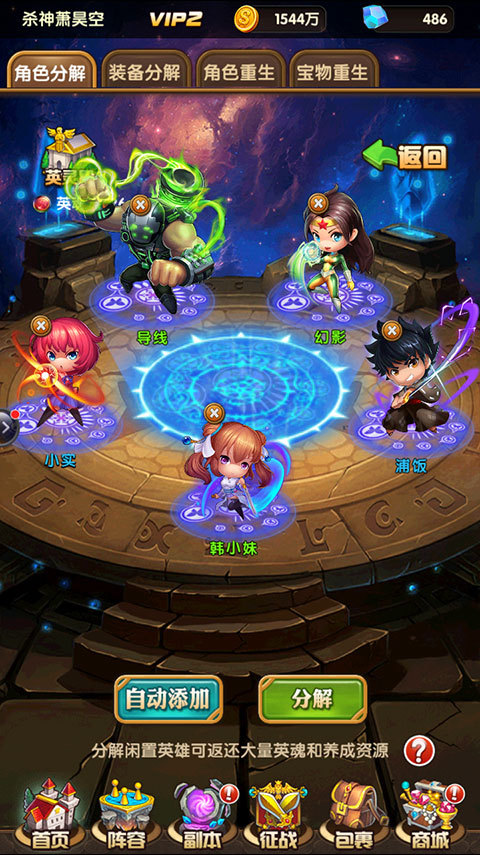 玩家可以点击屏幕中央的“+”手动选择想要分解的英雄,也可以点击下方“自动添加”按钮让系统自动添加,随后仍需点击分解按钮,避免玩家误操作。系统会优先选择品质低的英雄,最高会添加紫色品质的英雄进分解池,仍需使用紫色英雄的玩家在点击分解前需要注意。