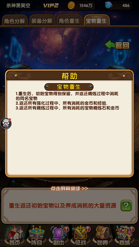 除此以外,针对强化后的英雄和宝物,还提供了重生功能。重生后会依据规则返还培养材料。