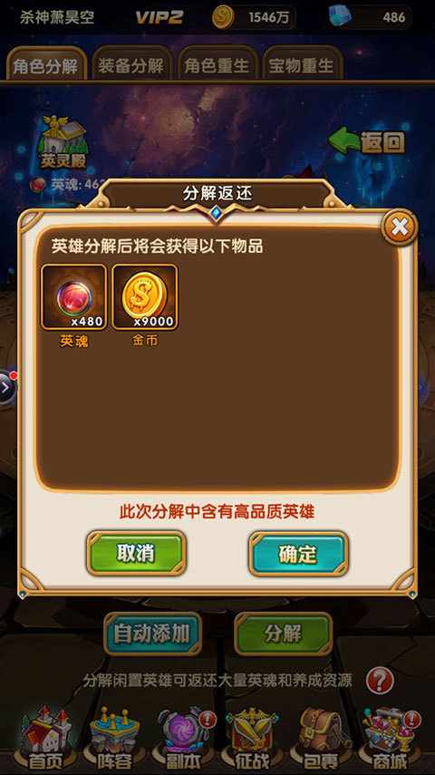 分解英雄可以获得金币和英魂奖励,英魂可在“英灵殿”中购买英雄碎片、培养剂、突破石等更多其他道具。