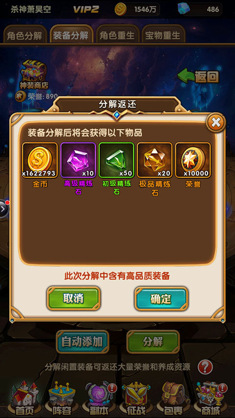分解装备后可以获得金币和荣誉奖励,荣誉可以在“神装商店”中购买蓝、紫、橙色各装备碎片,宝物精炼石、装备精炼石等道具。如果被分解的是高阶武器(如图)还会额外返还一定量的装备精炼石。