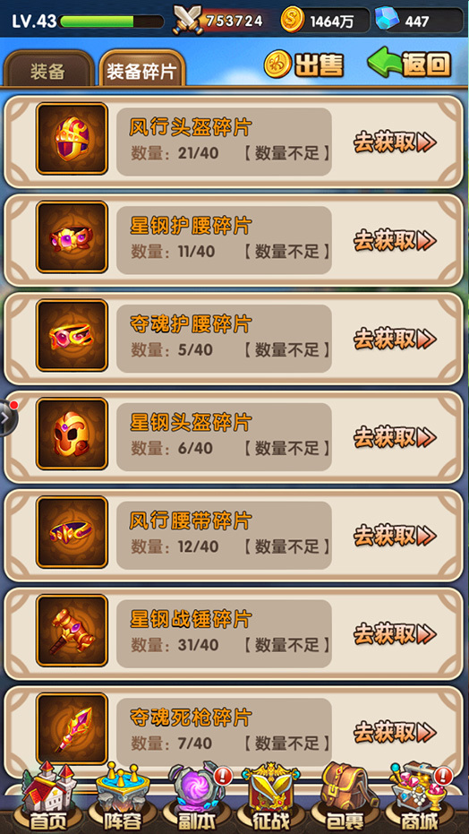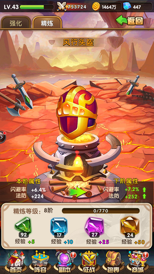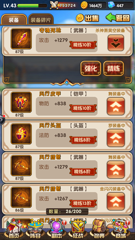 在首页左下角“装备”按钮里,筒子们可以查看到所有装备或是装备碎片的详细信息,实现装备的强化、精炼等功能(在阵容界面点击英雄身上的装备也能强化、精炼,还能进行更换、卸下等操作),碎片详情页则能实时了解到最新的装备碎片进度,专注搜集即将能合成成品的装备、及时合成碎片已集齐的装备。