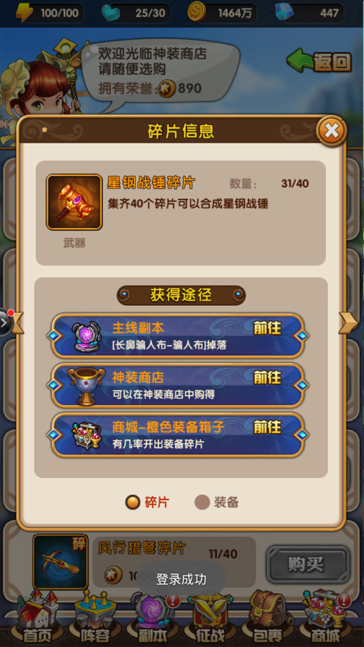 装备的获取途径十分多样,筒子们既可以攻打主线副本获取装备碎片,也可以在英雄塔里的神装商店通过荣誉点购买,土豪们更可以直接前往商城购买各色装备箱子开出装备碎片。