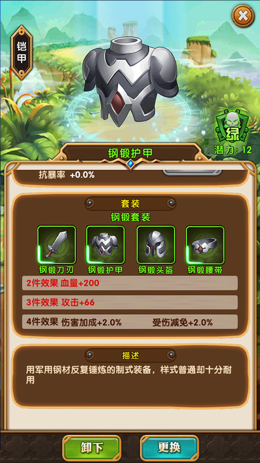 游戏里的装备从低到高一共分为绿、蓝、紫、橙、红五个等级,不同等级下设不同属性倾向的套装,有的偏血量、防御,有的偏攻击、暴击。