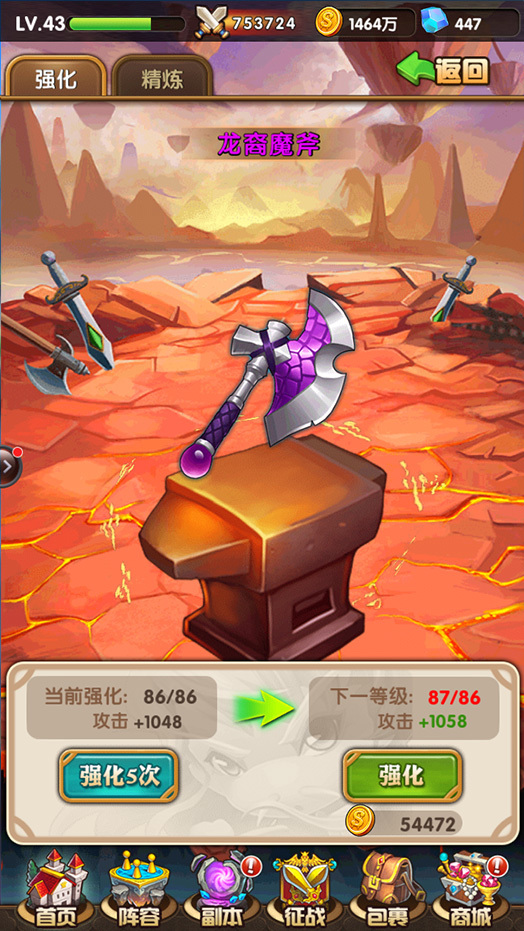 强化、精炼装备将能极大的提高战斗力,强化消耗金币,一次性强化5次容易触发“暴击”,“强化暴击”能自动免费多强化一定等级。精炼则需要消耗精炼石,本座建议在前期装备更换频率较高的情况下不要精炼装备,把精炼石省下来留给后期等级更高的装备能获得更大的收益,同时减少消耗(绿装别精炼,蓝装看情况)。