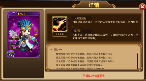 现期诸葛亮还是一位难得的武将卡,只能通过VIP宝箱,消费榜以及限时活动中获取。其卡位所配合的司马懿,士兵诸葛弩也会令这位武将卡的伤害大幅提升, 想获得这张武将卡的小伙伴还在等什么, 快来《新三国霸业》吧!