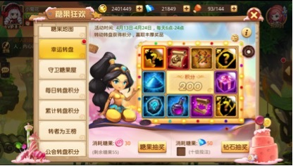为了感谢《童话大冒险》的每一个玩家的支持与厚爱,糖果狂欢节海量奖励约定你!只要你在游戏中完成各种日常活动,就能收集到海量糖果,并在幸运轮盘中使用它们,即可获得各种不同奖励。从新伙伴阿拉丁到灭世装备卷轴再到梦想家左轮枪以及绝版称号,都将统统为你打包。同时,你的转盘积分还能让你获得进入糖果屋的机会,让你在其中收获大量的钻石奖励!