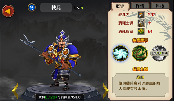 【戟兵】 【兵种简介】 活跃在战场上的万金油。旋风可以对敌人造成范围伤害。 ----我表示有点晕 【技能介绍】 旋风:旋风戟阵会对近距离的敌人造成有效杀伤。 包扎:包扎治疗己方部队,回复一定生命值。(..