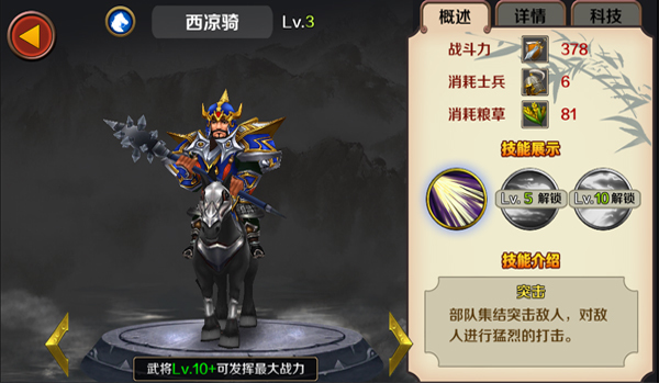 闪电突击:骑术卓绝的西凉骑有几率闪电般突击三次。(被动技能,兵种lv10时解锁)