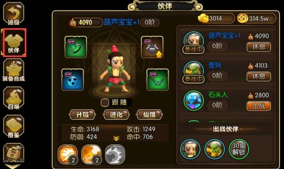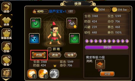 升级:是通过消耗突破丹来进行升级(突破丹获取途径:商店元宝、声望购买、系统活动、日常任务--伙伴升级奖励)