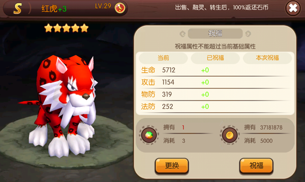 玩家在“祝福”界面通过对宠物进行祝福,可随机增加一定量的宠物属性。进行祝福需要消耗一定数量的金钱石币和道具“祝福石”。