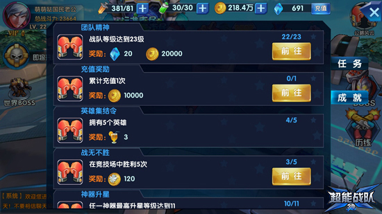 玩家在《超能战队3D》主界面下方的功能按钮中点击“任务”按钮,即可呼出任务界面。任务界面分为两大板块,一块是任务,另一块是成就。在成就页面中,玩家可以查看当前成就完成的进度,并且领取达到成就的奖励。玩家可以直接点击“前往”去完成对应的成就。而任务板块中显示的就是当前玩家可以完成的任务。任务分为主线任务与日常任务两个部分。完成主线任务玩家将获得少量金币和钻石的奖励,同时开启下一个主线任务。日常任务则是任务中的重点,完成日常任务之后,玩家可以获得战队经验、金币与活跃度的奖励。达到对应的活跃度,玩家就可以领取活跃度宝箱哦!