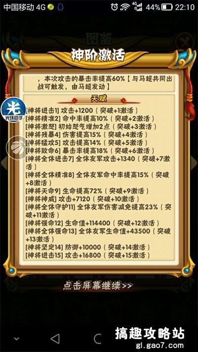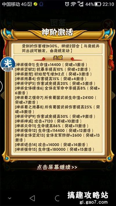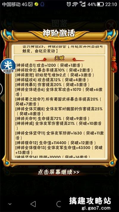 黄忠突破光环的主要属性是蜀国暴击20% 和全体加伤21% 魏延的是全体23%的伤害减免 徐庶的是蜀国武将伤害加成25%