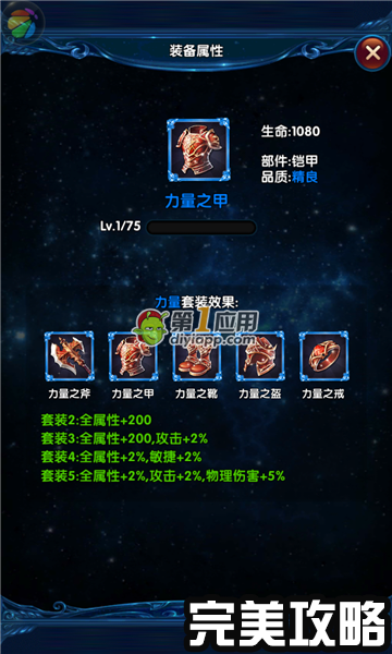 装备:力量之甲 等级1/75 部件:铠甲 品质:精良 属性:生命+1080 力量套装效果: 力量之斧、力量之甲、力量之靴、力量之盔、力量之戒。 套装2:全属性..