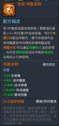 获得方法:强化4或以上惊鸿焚锋+合成.鸣凰金刺+3个绛霞丹砾