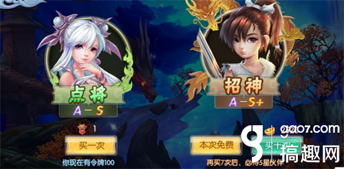 4. 招神: 点击游戏主界面右上【招募】按钮,进入招募系统界面后,采用元宝进行抽卡,每次随机抽取A - S+英雄。每两天有一次免费抽取的机会,免费抽取机会使用后,可使用280元宝抽一次,2520元宝抽十次。