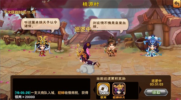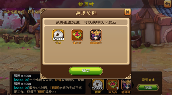 当一个城池的巡逻倒计时结束时,则本次巡逻完成,巡逻完成后不再获得奖励,玩家可以手动领取本次巡逻所获得奖励。奖励中必定包括巡逻武将的碎片,还有更多有用的道具哦!