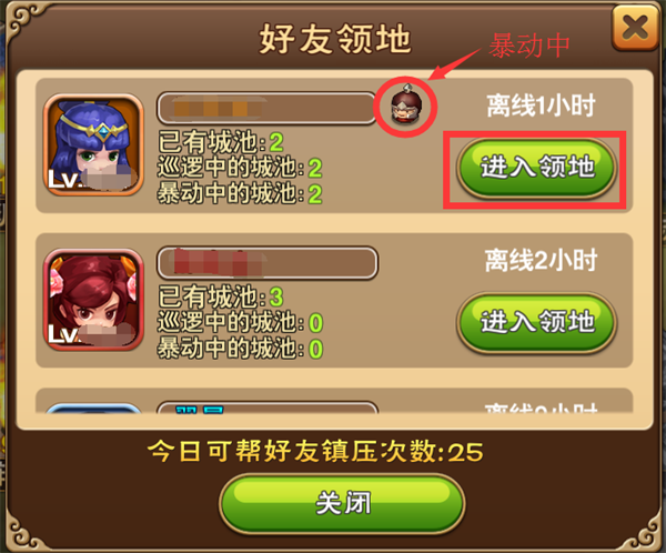 当玩家城池处于暴动状态时,好友可以帮忙镇压暴动。