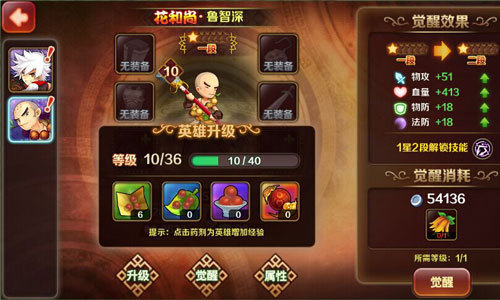 养一枚高阶英雄,光升级是远远不够滴。在《暴走水浒》中,当诸位好汉在游戏中的银币、材料满足觉醒需求时,可以对英雄觉醒,提升英雄大量基础战斗属性外,还将跟随觉醒阶段解锁追打技能,合理使用可以组成更强大的阵容。另外,当英雄的觉醒段满时,可对英雄进行突破,突破除得到英雄新的属性外,还会提升英雄的技能和星级,是游戏里高级养成玩法。